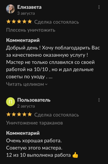 Я лично отвечаю за работу свою и каждого мастера, со мной работает мой сын и только проверенные люди.